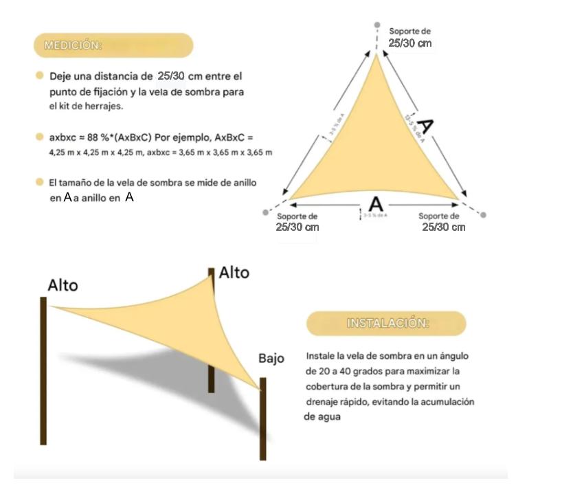Nota: tomar en cuenta que la tela estira un 10% aproximadamente mas el espacio que ocupan los tensores. Se recomienda dejar un espacio para los anclajes, 25/30 cm desde la argolla metalica del toldo hasta el gancho en el pilar o pared siempre conservando los anclajes en forma diagonal o X.
