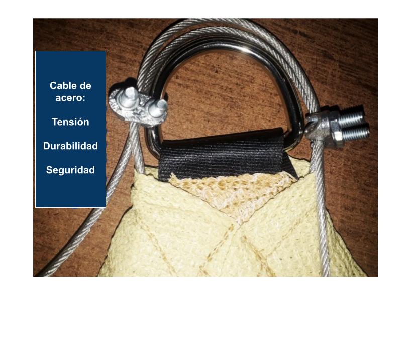 Coloque cable de acero por todo el contorno de la malla dentro del bolsillo interior de la costura y asegurar el cable de acero en el cruze o cierre con candados de seguridad (abrazaderas), para una tensión pareja, también ayuda con la durabilidad del toldo.