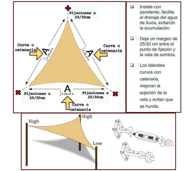 Consejo: los puntos deben quedar alineados con las esquinas en forma diagonal o de X, prolongando en diagonal de cada esquina unos 30 cm del toldo hasta el anclaje y en distintos niveles para favorecer el escurrimiento del agua y humedad.
